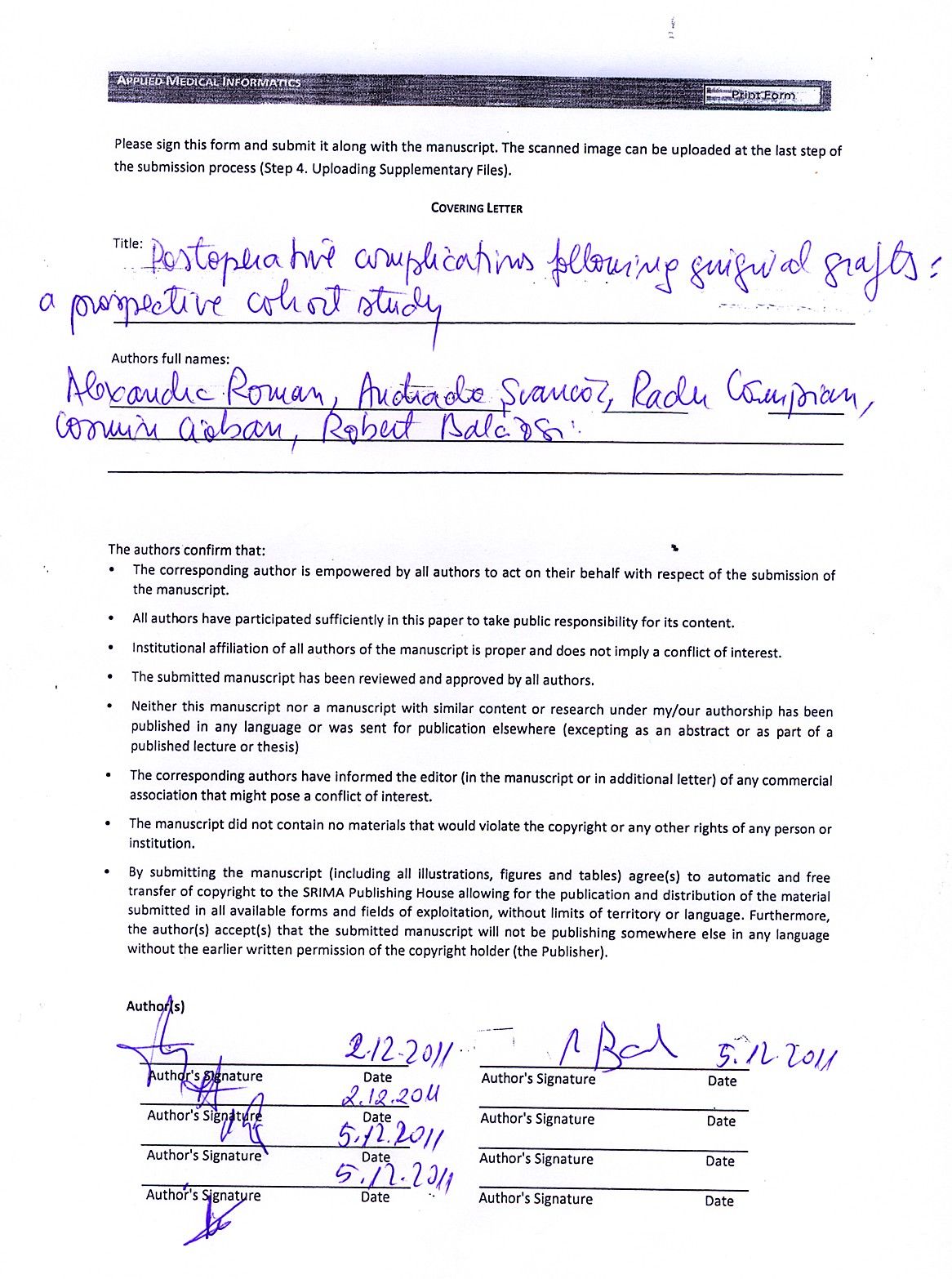 Aim: Treating gingival recessions (GRs) is a challenge for the practitioner who must take into consideration objective clinical factors, subjective symptoms and also factors related to the patient’s expectations. The aim of this study was to evaluate the postoperative complications associated with connective tissue graft (CTG) plus coronally advanced flap (CAF) and free gingival graft (FGG) used to cover GRs and to compare post-operative morbidities for the two groups of procedures. Material and Methods: A total of 17 patients diagnosed with GRs ≥2mm were treated using CTG plus CAF or FGG. Post-operative complications were evaluated with a questionnaire given to the patients at 14 days follow-up visit. The study used a 1 to 10 visual analogic scale (VAS) and the levels of outcomes were classified as “none to minimum” “moderate” and “very important/severe”. Results: A total of 21 procedures, 10 CTG plus CAG and 11 FGG were included in the analysis. No palatal bleeding and no severe pain or swelling were recorded. The patients experienced more pain in the grafted area than in the donor area, for both surgical techniques, with a mean value of 3.09 (1.3 sd) versus 2.27 (1.4 sd) for CTG plus CAF group and of 3.7 (2.21 sd) versus 2.9 (1.7 sd) for FGG group, respectively. CTG plus CAF generated significantly higher scores of tumefaction than FGG, the mean values being 2.45 (0.93 sd) and 4 (2.21 sd) (t value 2.12, p<0.05) respectively. Conclusion: The complications associated with the two periodontal surgical approaches seem manageable and clinically acceptable.