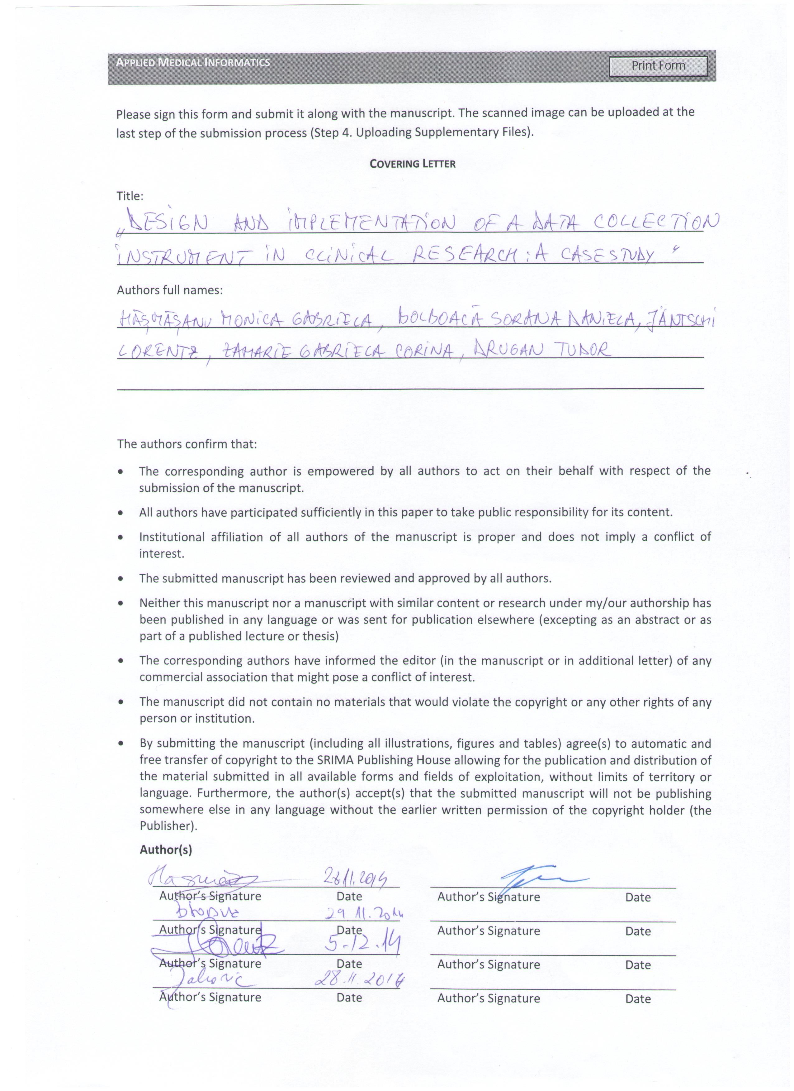 Aim: The aim of our research was to design and implement data collection instruments to be use in context of an observational prospective clinical study with follow-up conducted on new born with intrauterine growth restriction. Methods: The structure of the data collection forms (paper based and electronic based) was first identified and for each variable the best type to accomplish the research aim was established. The code for categorical variables has also been decided as well as the units of measurements for quantitative variables. In respect of good practice, a set of confounding factors (as gender, date of birth, etc.) have also been identified and integrated in data collection instruments. Data-entry validation rules were implemented for each variable to reduce data input errors when the electronic data collection instrument was created. Results: Two data collection instruments have been developed and successfully implemented: a paper-based form and an electronic data collection instrument. The developed forms included demographics, neonatal complications (as hypoglycemia, hypocalcemia, etc.), biochemical data at birth and follow-up, immunological data, as well as basal and follow-up echocardiographic data. Data-entry validation criteria have been implemented in electronic data collection instrument to assure validity and precision when paper-based data are translated in electronic form. Furthermore, to assure subject’s confidentiality a careful attention was given to HIPPA identifiers when electronic data collection instrument was developed. Conclusion: Data collection instruments were successfully developed and implemented as an a priori step in a clinical research for assisting data collection and management in a case of an observational prospective study with follow-up visits.Downloads