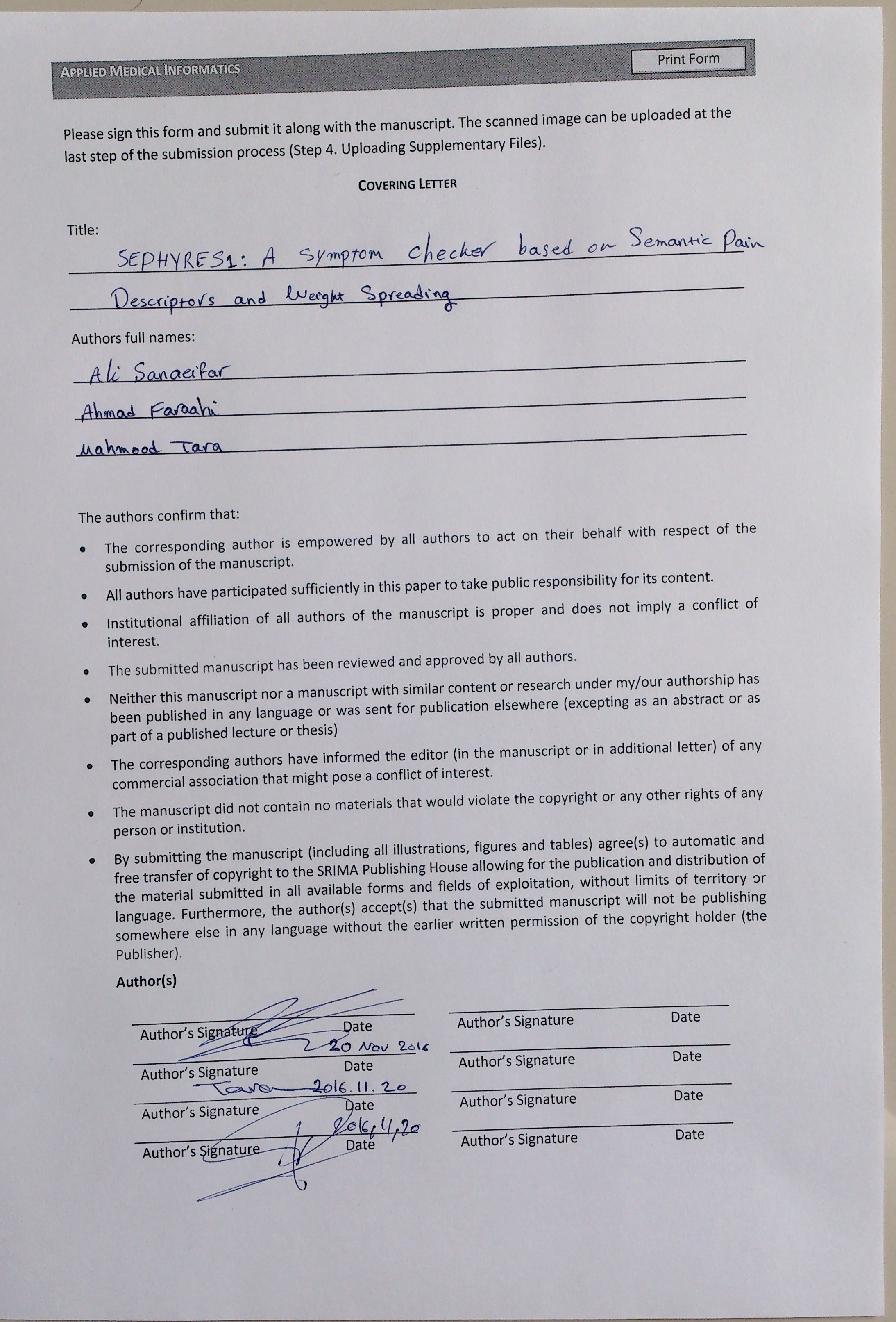 SANAEIFAR A, FARAAHI A, TARA M. SEPHYRES 1: A Symptom Checker based on Semantic Pain Descriptors and Weight Spreading. Appl Med Inform [Internet]. 2016 Dec. 29 [cited 2026 Jan. 10];38(3-4):105-16. Available from: https://ami.info.umfcluj.ro/index.php/AMI/article/view/607